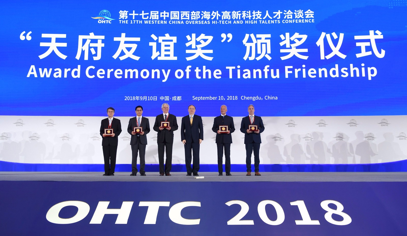 9月10日上午,在第十七届“海科会”开幕式暨天府论坛上,省委副书记邓小刚为六位第四届“海科杯”获奖者颁奖。他们分别是荣新起、王俊莅、侯锋、翟震、刘华兴、顾毅风。