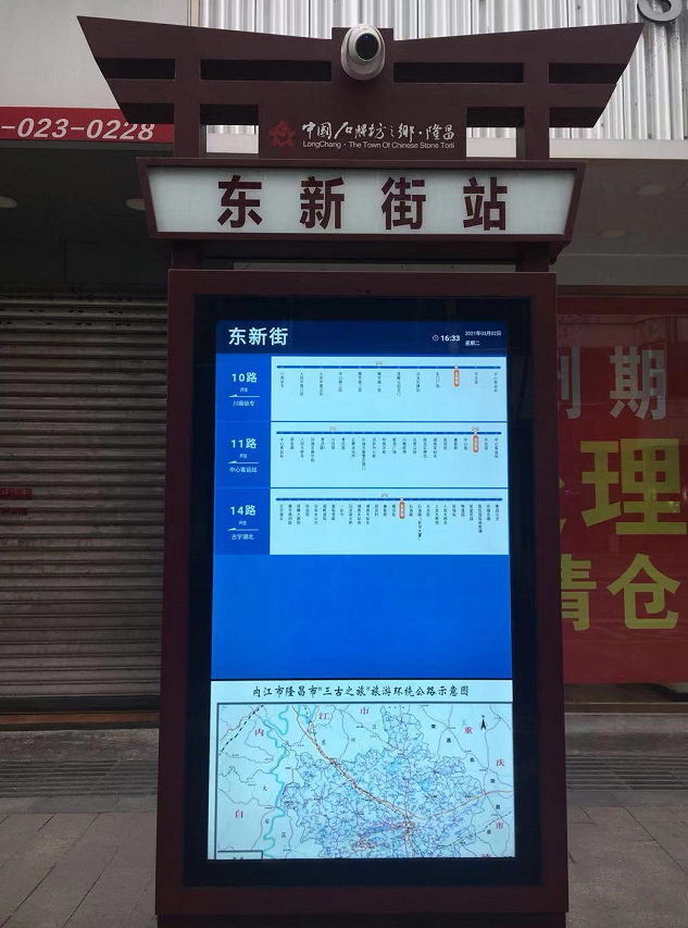 隆昌市交通运输局相关负责人介绍,电子站牌通过指挥调度中心和公交车上的GPS连接,发布所有经过线路公交车辆的实时到站信息,为候车乘客提供实时准确的车辆到站预报,实现“绿色出行、智慧出行、快乐出行”。