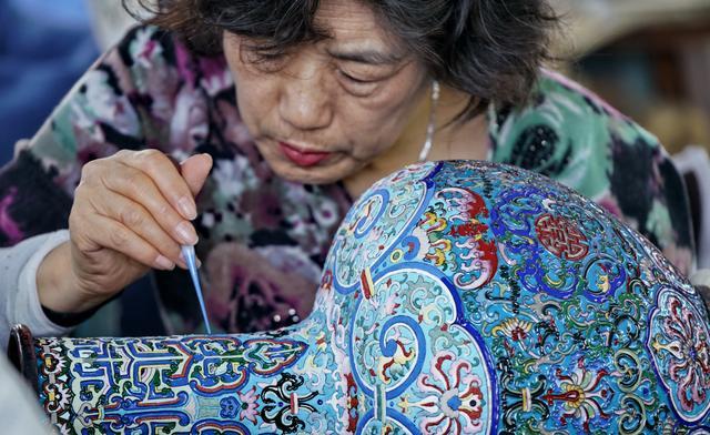 一名技师在为景泰蓝作品进行第二次点蓝(图据新华社 2019年12月4日摄)。