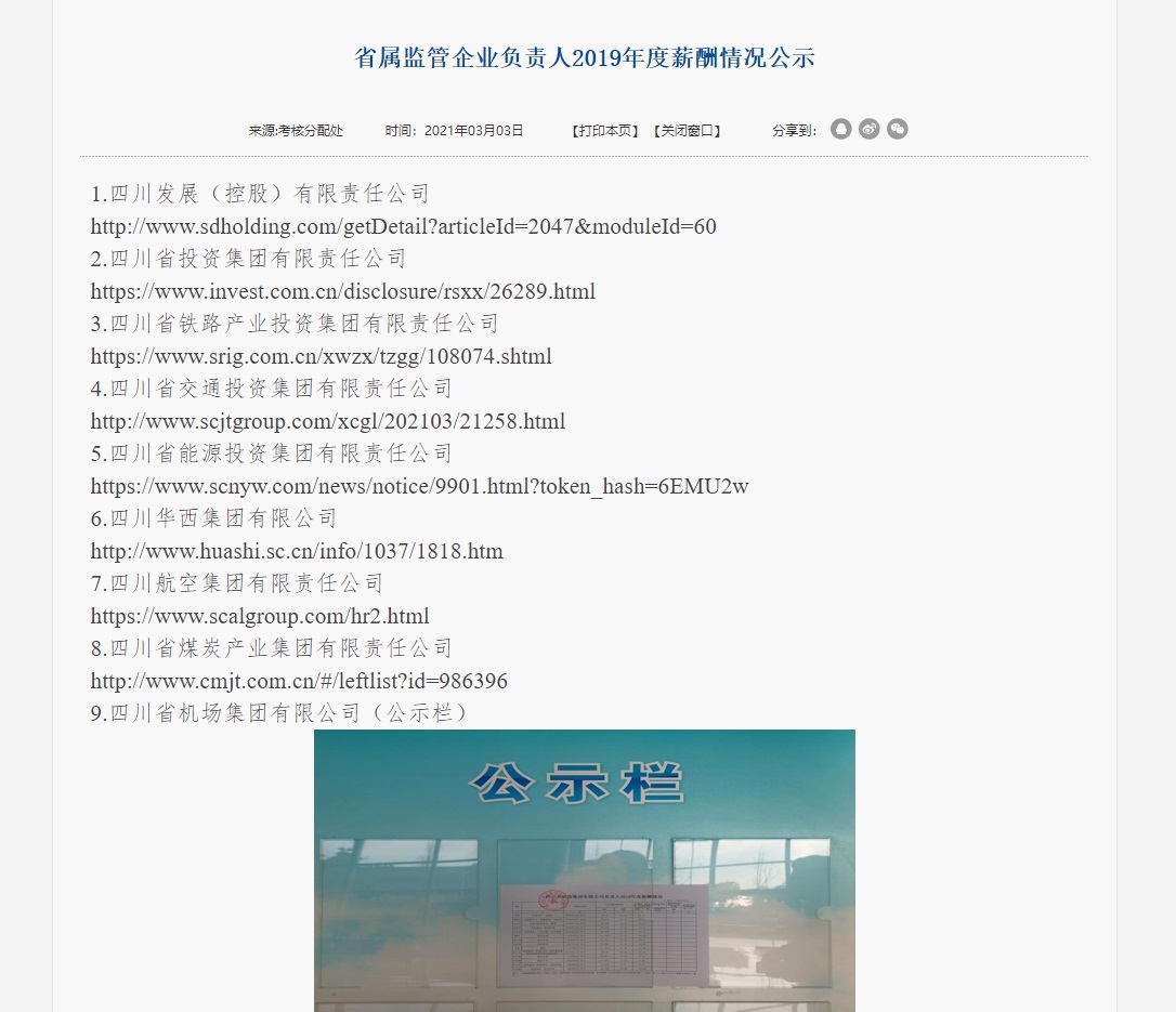 20户省属企业,包括四川发展(控股)有限责任公司、四川省投资集团有限责任公司、四川省铁路产业投资集团有限责任公司、四川省交通投资集团有限责任公司等。其中,18户省属企业通过官网进行了公示,只有四川省机场集团有限公司和四川省国有资产投资管理有限责任公司2户企业通过公布张贴在“公示栏”的照片进行公示。