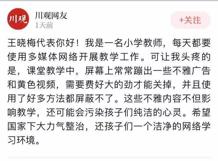 “王晓梅代表你好!我是一名小学教师,每天都要使用多媒体网络开展教学工作。可让我头疼的是,课堂教学中,屏幕上常常蹦出一些不雅广告等,需要费好大的劲才能关掉。”3月3日,乐山网友“嘉州跳跳糖”向全国人大代表、四川省眉山市青神中学副校长王晓梅留言,希望她帮忙呼吁相关部门加大整治,还孩子们一个洁净的网络学习环境。