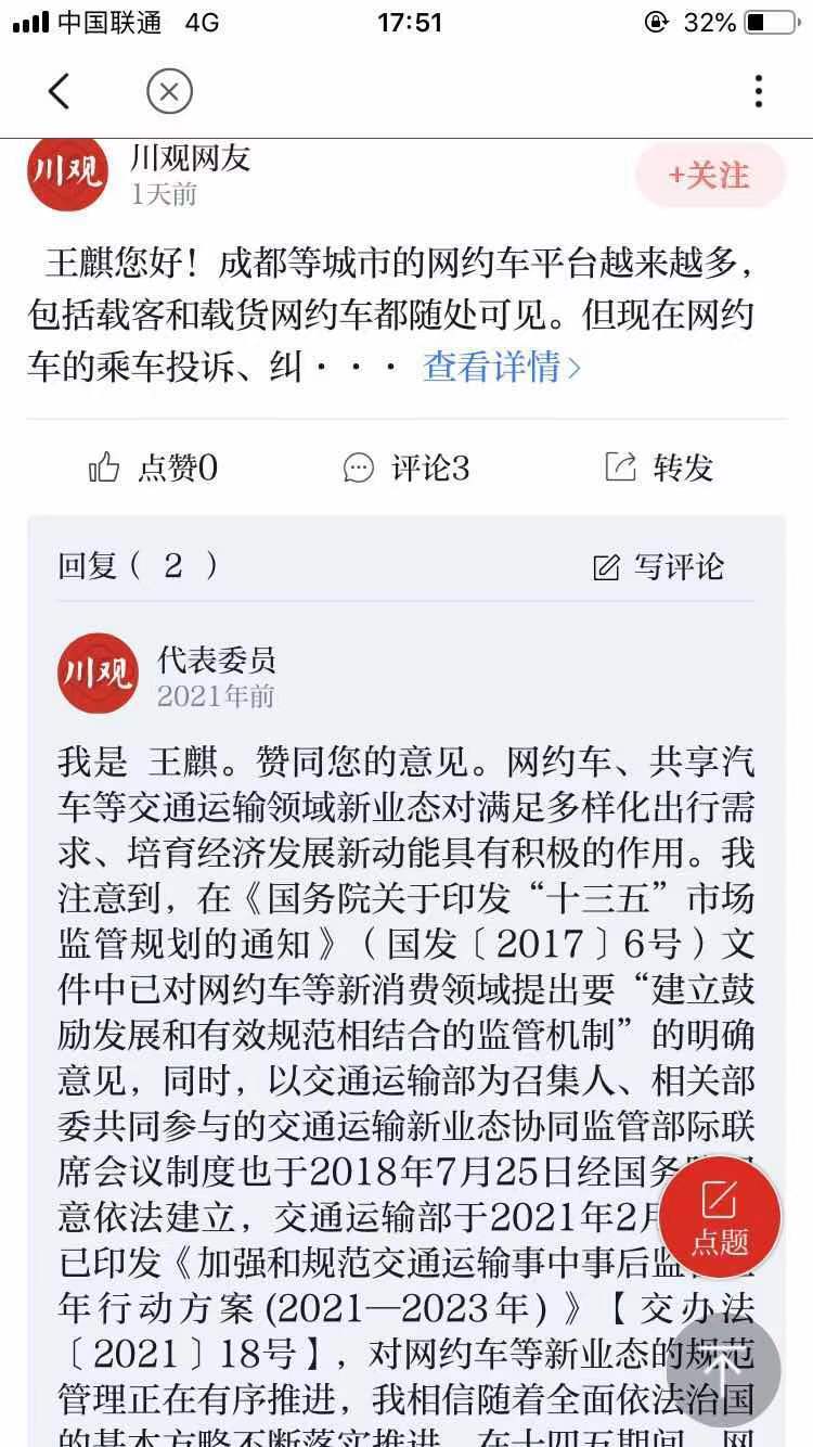 3月3日,网友“小林”向全国人大代表、四川省工商联副主席、四川启阳汽车集团有限公司董事长王麒留言,反映城市网约车实际提供服务的车辆或驾驶员,与线上预约的不一致等线上线下“两张脸”等问题,建议将网约车像出租车一样进行规范管理。