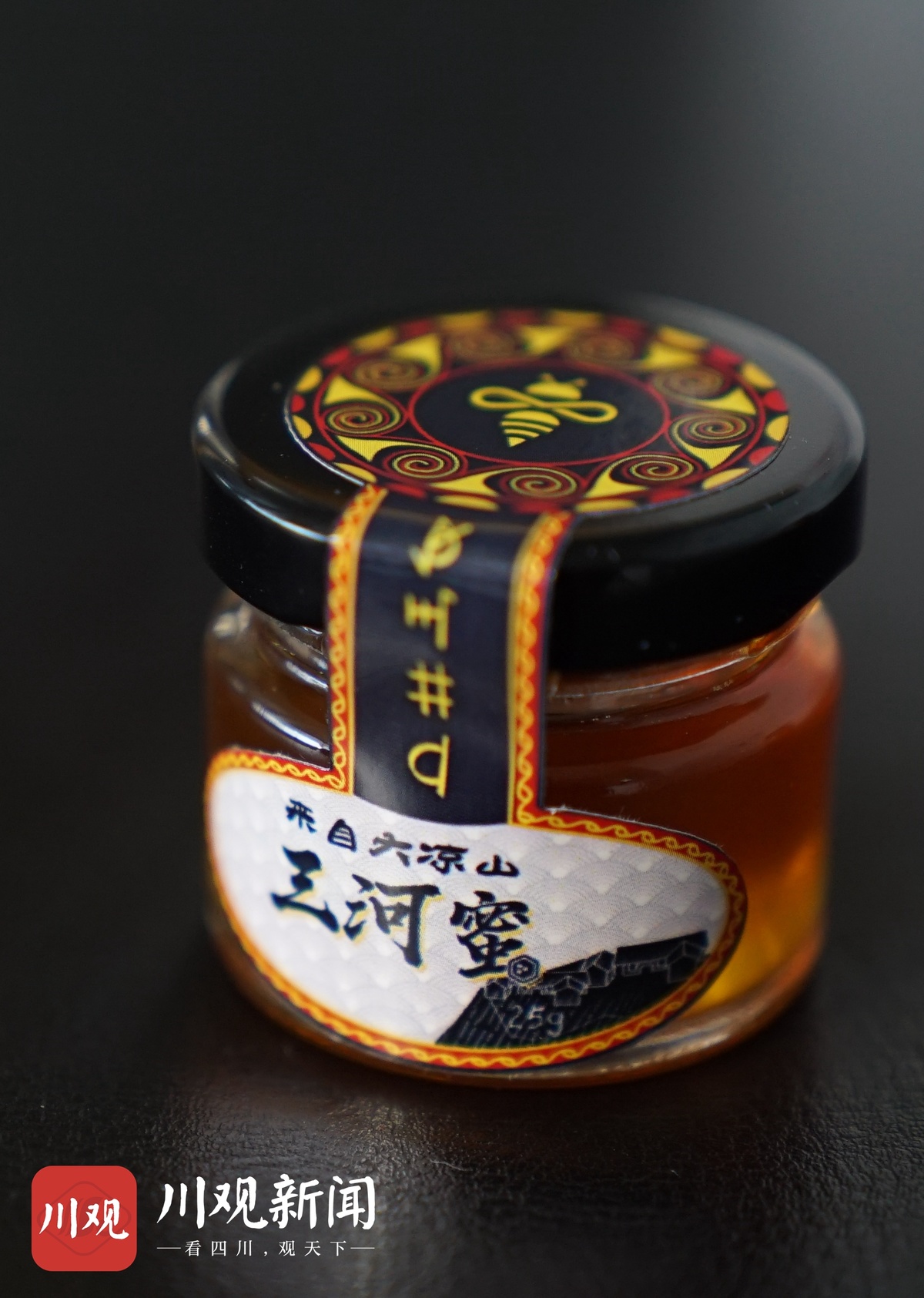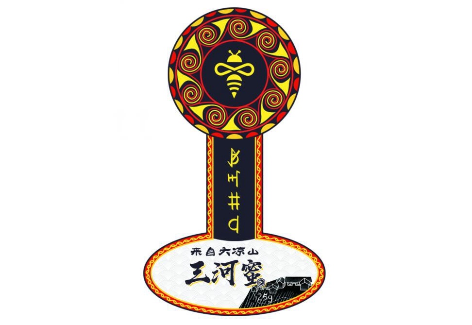 由川观新闻设计的“三河蜜”包装,采用了彝族典型的“红黄黑”色调,玻璃罐顶部的图样融合了彝族漆器、蜜蜂等视觉元素,瓶身上则加入了三河村新居手绘、彝文等特色元素,精致亮眼、独具匠心。