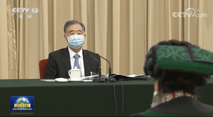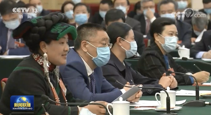 3月5日下午, 北京,人民大会堂西大厅。出席十三届全国人大四次会议的四川代表团举行全体会议。当天下午,作为四川选出的全国人大代表,中共中央政治局常委、全国政协主席汪洋与四川代表团全体代表一同审议政府工作报告。会场上大家积极发言,来自凉山的代表吉克石乌获得发言机会,她向汪洋主席分享了家乡的故事。