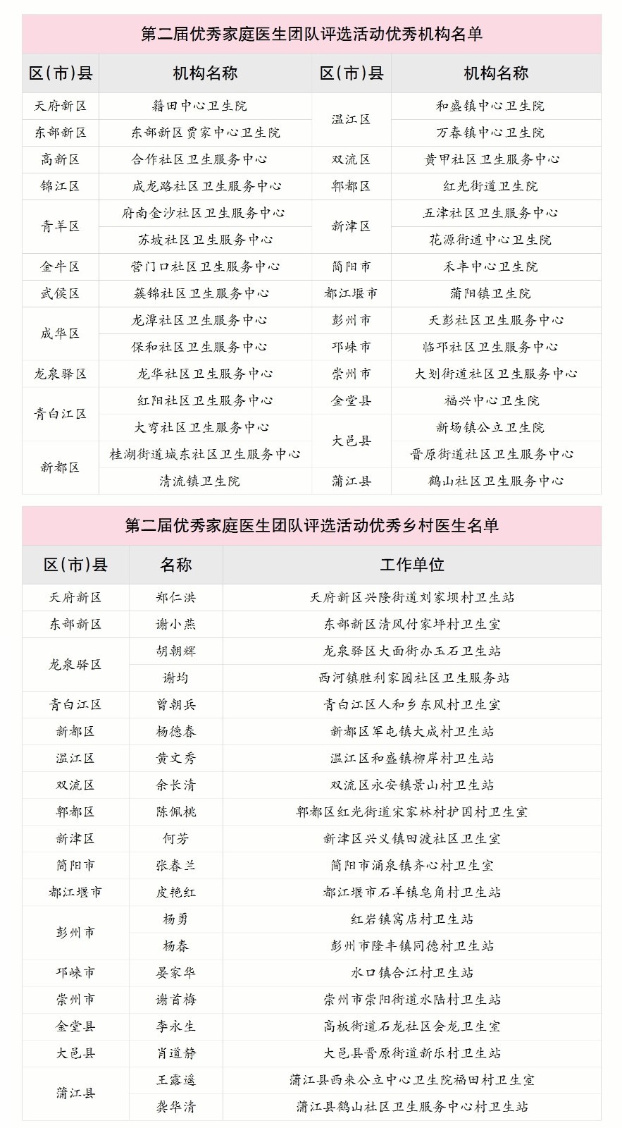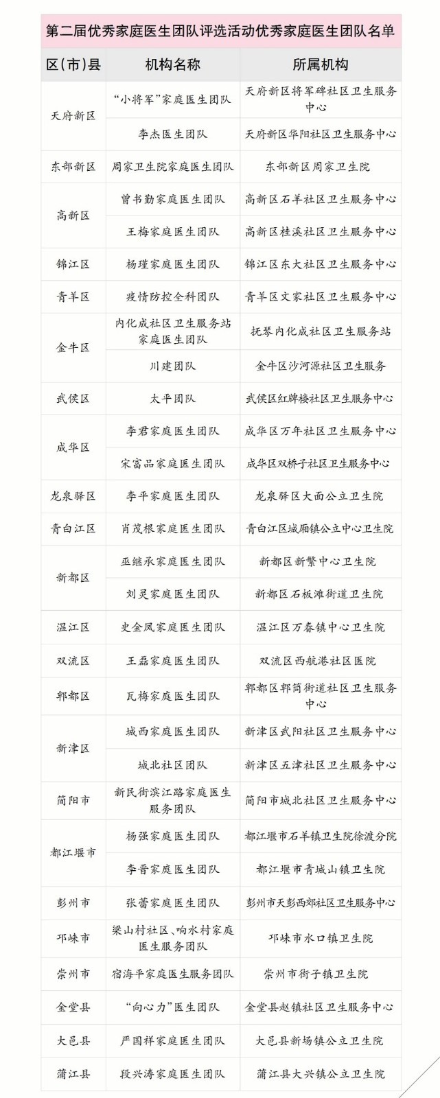 记者从成都市卫健委获悉,按照成都市卫生健康委员会《关于做好第二届优秀家庭医生团队评选活动的通知》精神,经推荐申报、网络投票、专家评审,成都市卫健委评选出“优秀家庭医生团队”30支,“优秀基层医疗机构”30个,“优秀乡村医生”20名,结果如下: