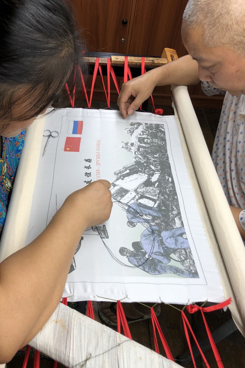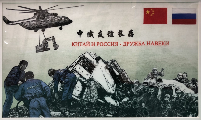 在这幅《中俄友谊长存》蜀绣纪念品上,两排“中俄友谊长存”的中俄文字样首先映入眼帘。主体则是中俄人员共同参与抗震救灾的艺术加工场景画面,左上角还有米-26重型直升机吊运挖掘机的图样。为何会有如此创意?
