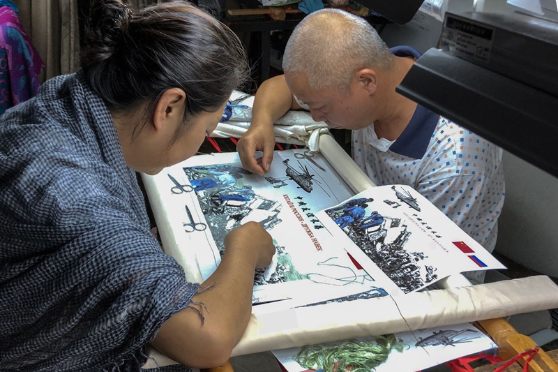 这样的重任,落在了四川省民间艺术优秀传承人白桦的肩上。从事蜀绣超过三十年,得知要在短时间内完成这样一幅特别的纪念品,白桦面露难色:“彩色的不可能,黑白的倒是可以试试!”黑白?那为何不将版画和蜀绣结合在一起?