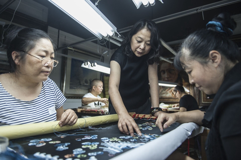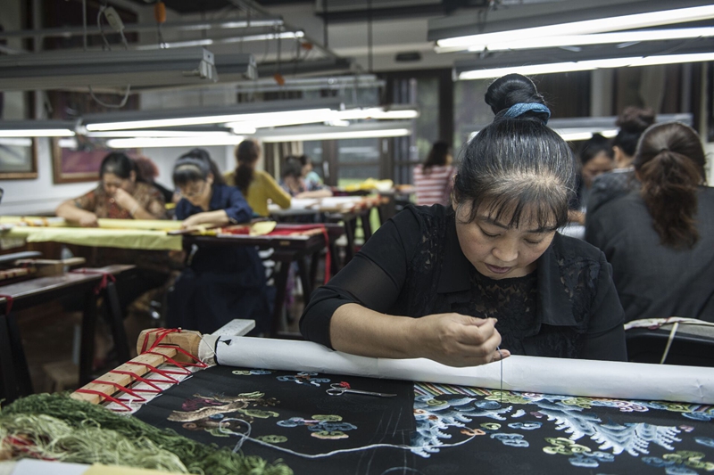 56岁的绣师刘贤顺是蜀绣工作室并不多见的男性,主动接过夜班的工作。“要是困了,就抽杆烟、喝口茶。” 这位绣龄超过四十年的资深绣师表示,工期虽然赶,但人人都不可马虎,必须做到“零差错”。