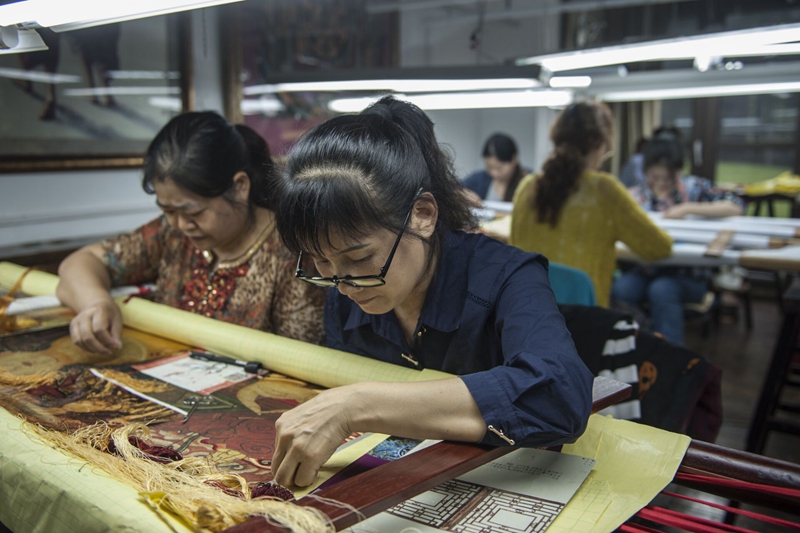 为了完成好这件特别的绣品,白桦和另外三个绣师分成两组,白天黑夜轮班倒,“白班从早上8点到晚上7点,夜班从7点到第二天8点,只有‘人停针不停’”。为了尽可能提高效率,还专门安排了两个人承担分线的工作,白桦说:“分线,就是要将每根线分成16丝,刺绣时只用其中1丝。”