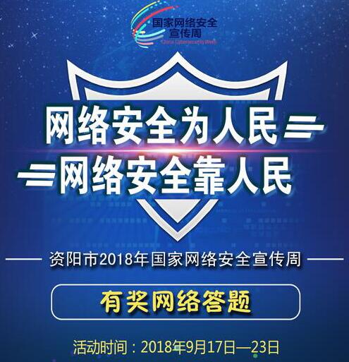 为贯彻落实习近平总书记在全国网络安全和信息化工作会议上“深入开展网络安全知识技能宣传普及,提高广大人民群众网络安全意识和防护技能”的重要讲话精神,落实全省网络安全和信息化工作会议精神,9月17日,由中共资阳市委宣传部、市委网信办主办,川报观察、四川在线资阳频道承办的资阳市2018年国家网络安全宣传周有奖答题活动重磅上线!