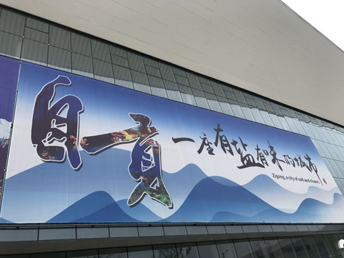 20日,记者在成都世纪城新会展中心西博会现场看到,在3号展厅幕墙上,一副432平方米的自贡城市宣传广告映入眼帘,设计独特,气势恢宏。