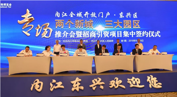 9月20日至9月24日第十七届中国西部国际博览会如期于成都举办。9月19日,内江市东兴区举行“内江全域开放门户•东兴区‘两个新城三大园区’专场推介会暨招商引资项目集中签约仪式”。