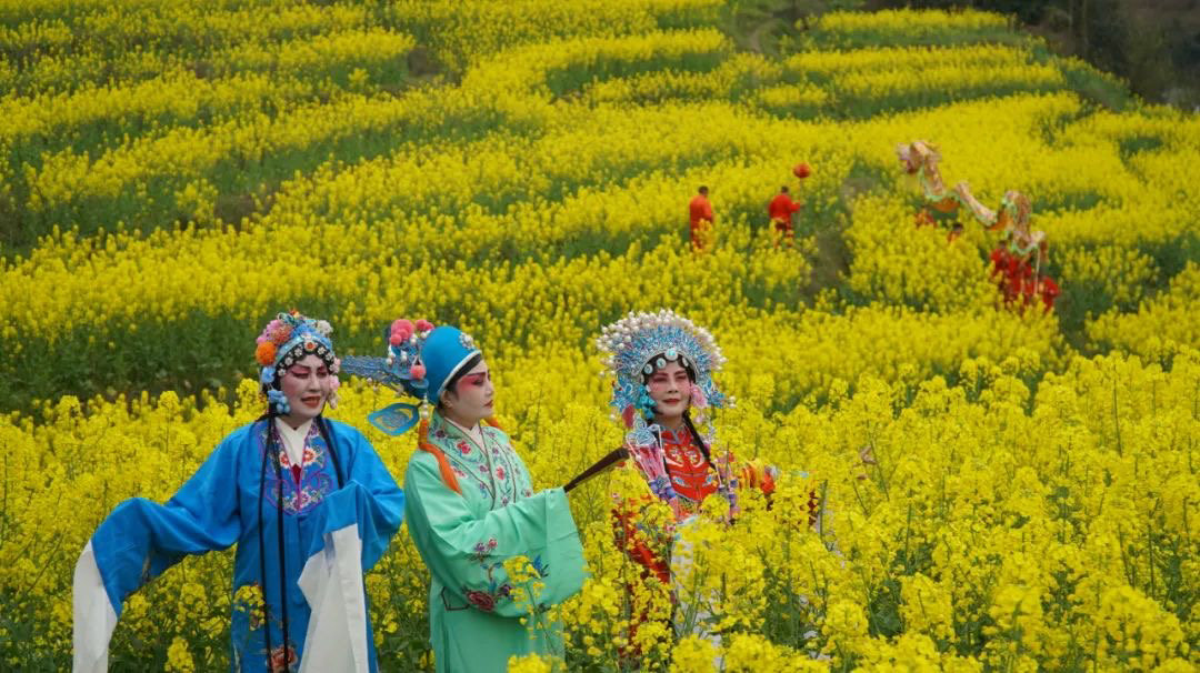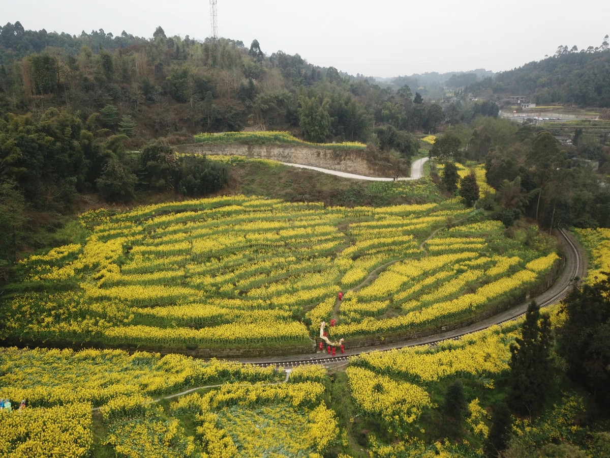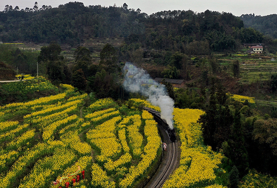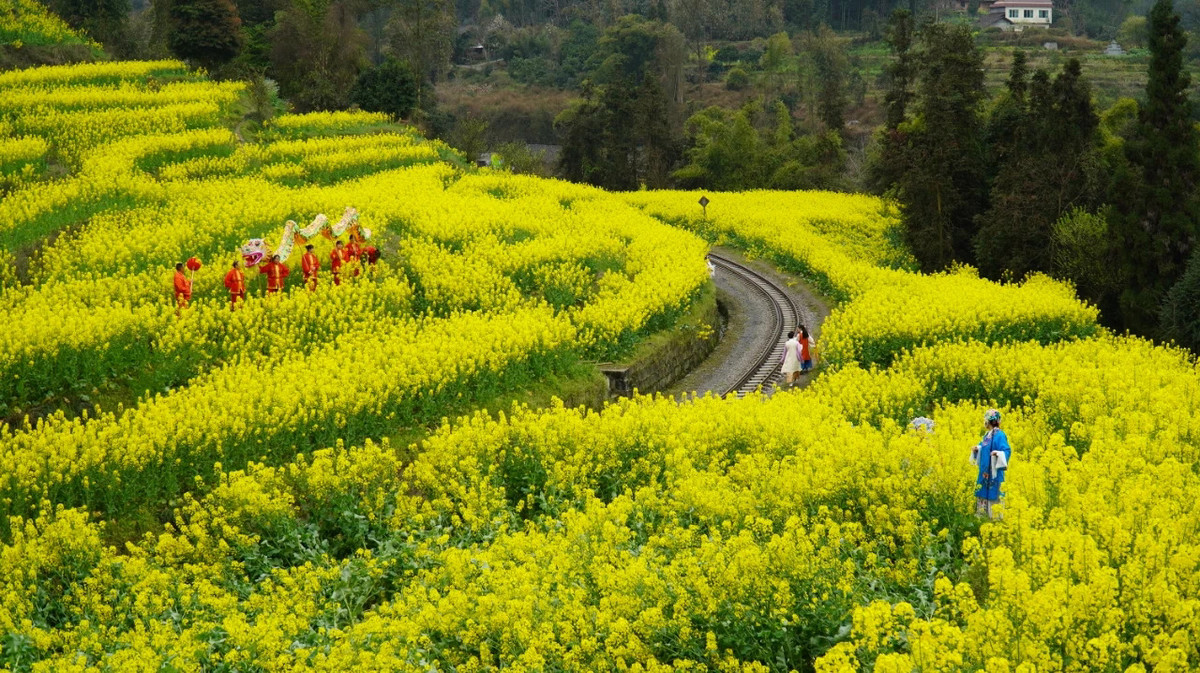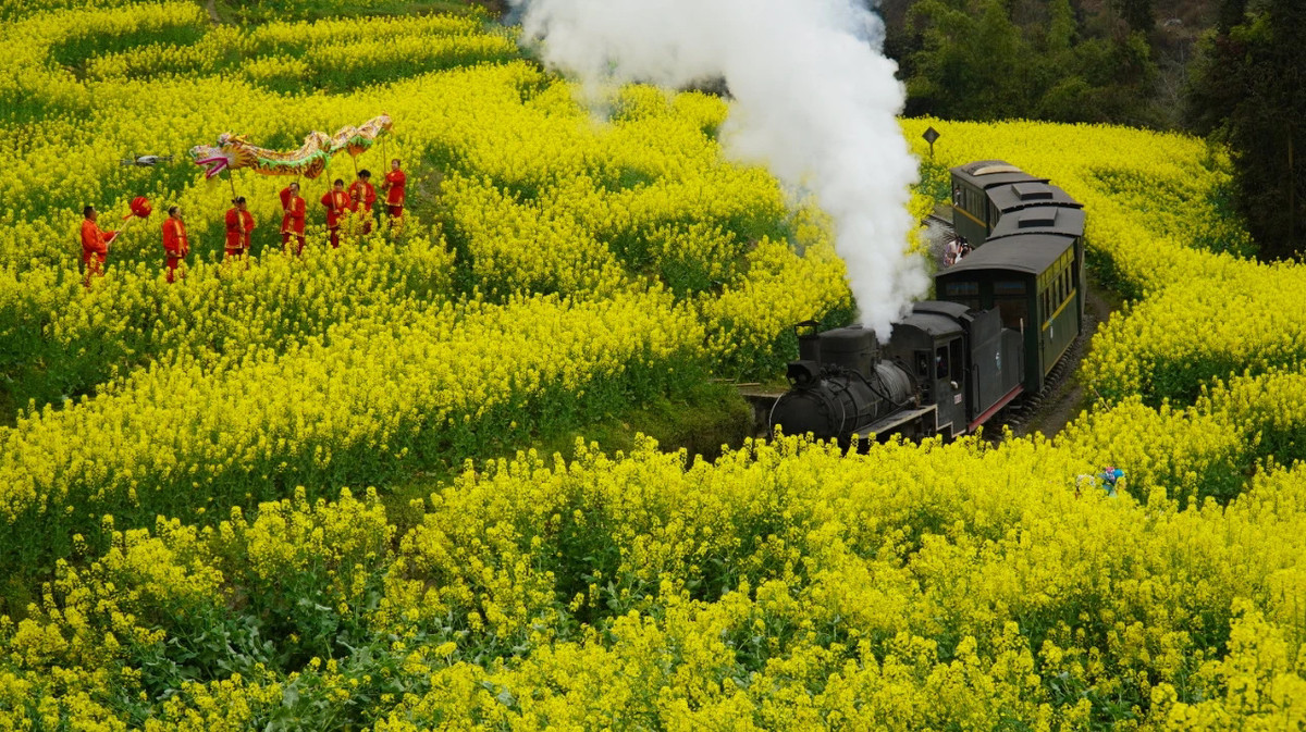 当G字头的高铁以300公里的时速在全国主干道铁路上行驶时,时速30公里不到的嘉阳小火车,穿梭在春花烂漫间。这辆“绝版”的小火车在“咣当咣当”慢游中,“劈开”一道道油菜花金色“波浪”。四处成片的桃花、李花,更让人仿佛感觉到置身于世外桃源。