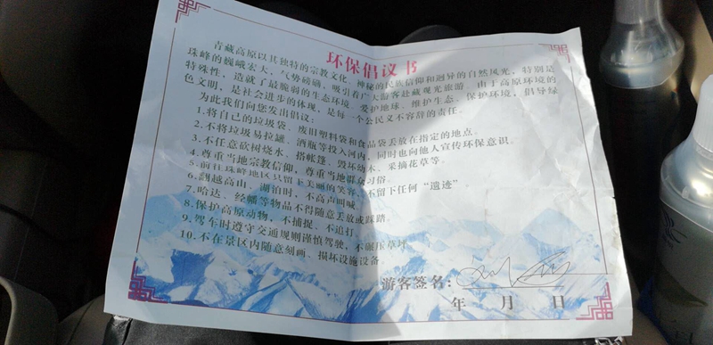 进入珠穆朗玛国家森林公园,每车必发一份“环保协倡议书”,并要求游客每人签字,这一举措,足见对珠峰环保的重视。