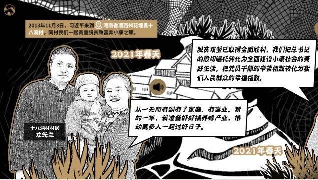 点击H5中村民和代表照片旁边的喇叭按钮,听到的是各地不同的方言,但,通过H5,我们能听到他们用乡音讲述脱贫奔康的共同心声。