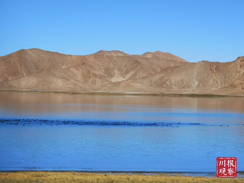 沿湖有长长沙滩,和湖水犬牙交错,极尽妩媚,另一侧长了高低不一的绿草,风过去,起伏不定。蓝湖的深处,偶然掠过白色或黑色的影子,它们便是班公湖的水鸟,每年都从遥远的地中海飞来此处安身。