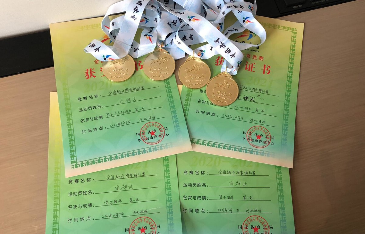 据了解,3月6日至8日,2020-2021赛季全国跳台滑雪锦标赛在河北保定举行,比赛共设女子个人标准台、男子个人标准台、男子个人大跳台、男子团体、混合团体5个项目。经过两天的激烈角逐,宋祺武获得男子K90m标准台、K120m大跳台两个个人项目冠军,以及混合团体K90m标准台、男子团体K120m大跳台两个团体项目桂冠。