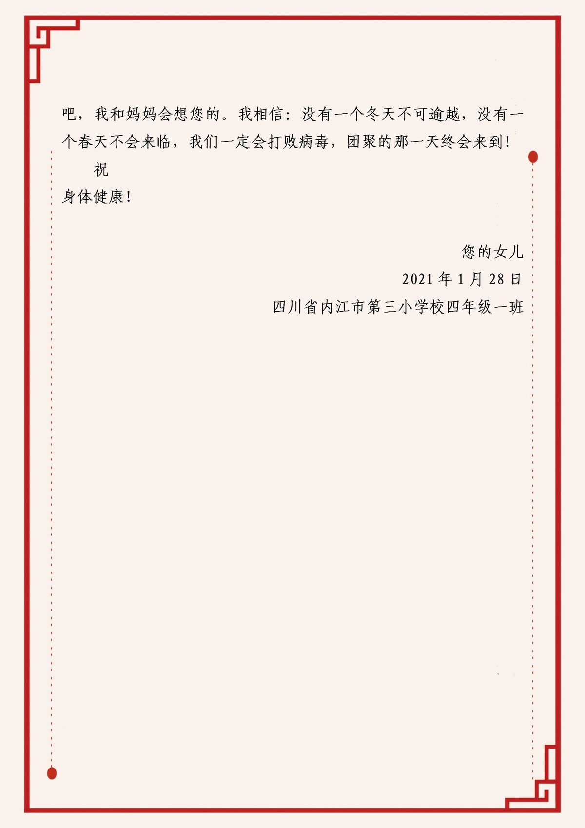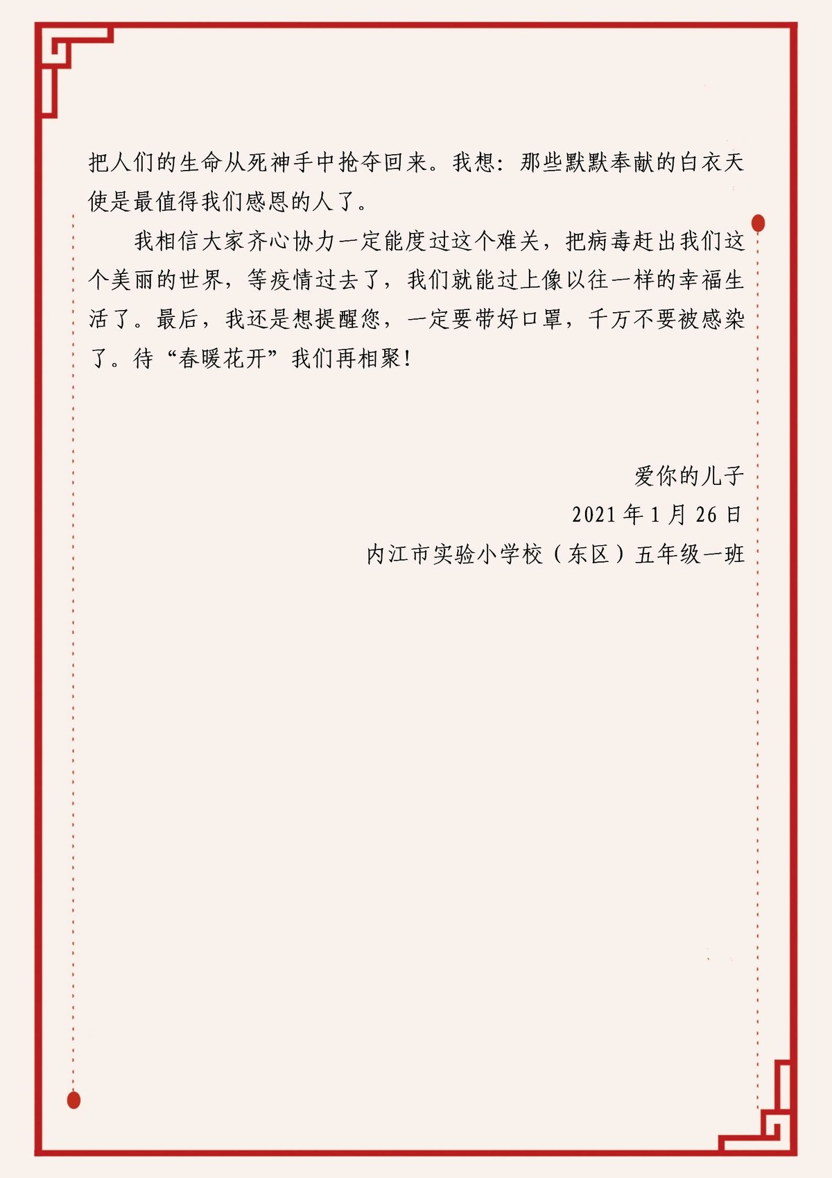 近日,“齐心助力抗疫情,一封家书连亲情”主题教育活动在内江市东兴区、市中区两地启动。两地组织区域内4到9年级学生写一封家书,向身边或在外地的一位亲人说出自己的节日问候、学习生活近况、家乡变化等,传递温情与感恩,凝聚奋进力量。