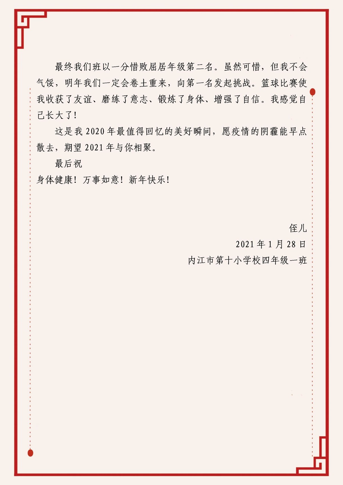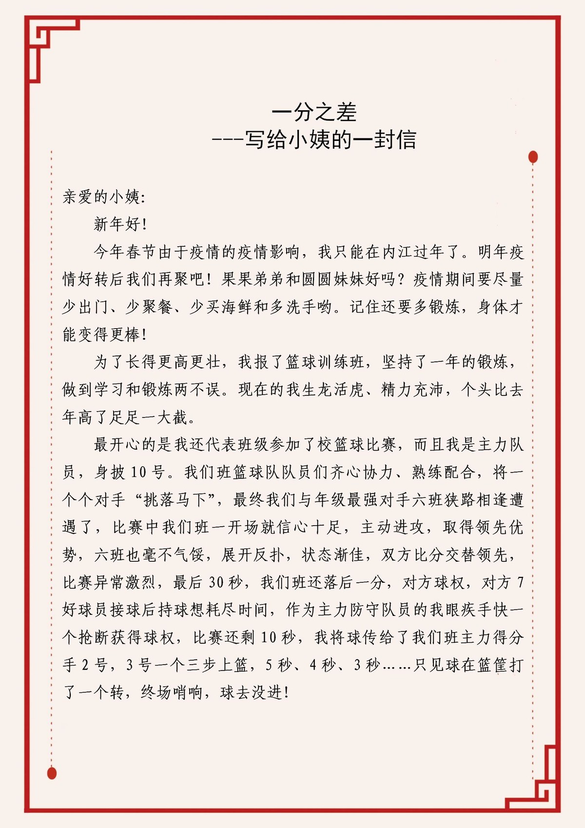 作品三《一分之差——给小姨的一封信》