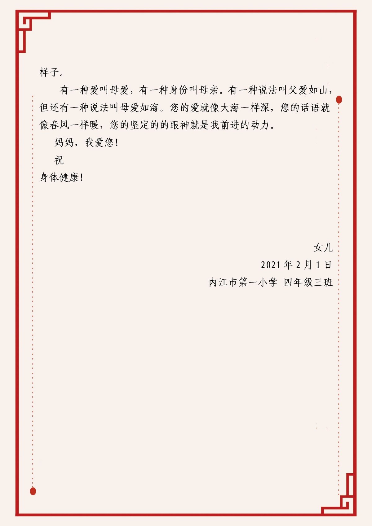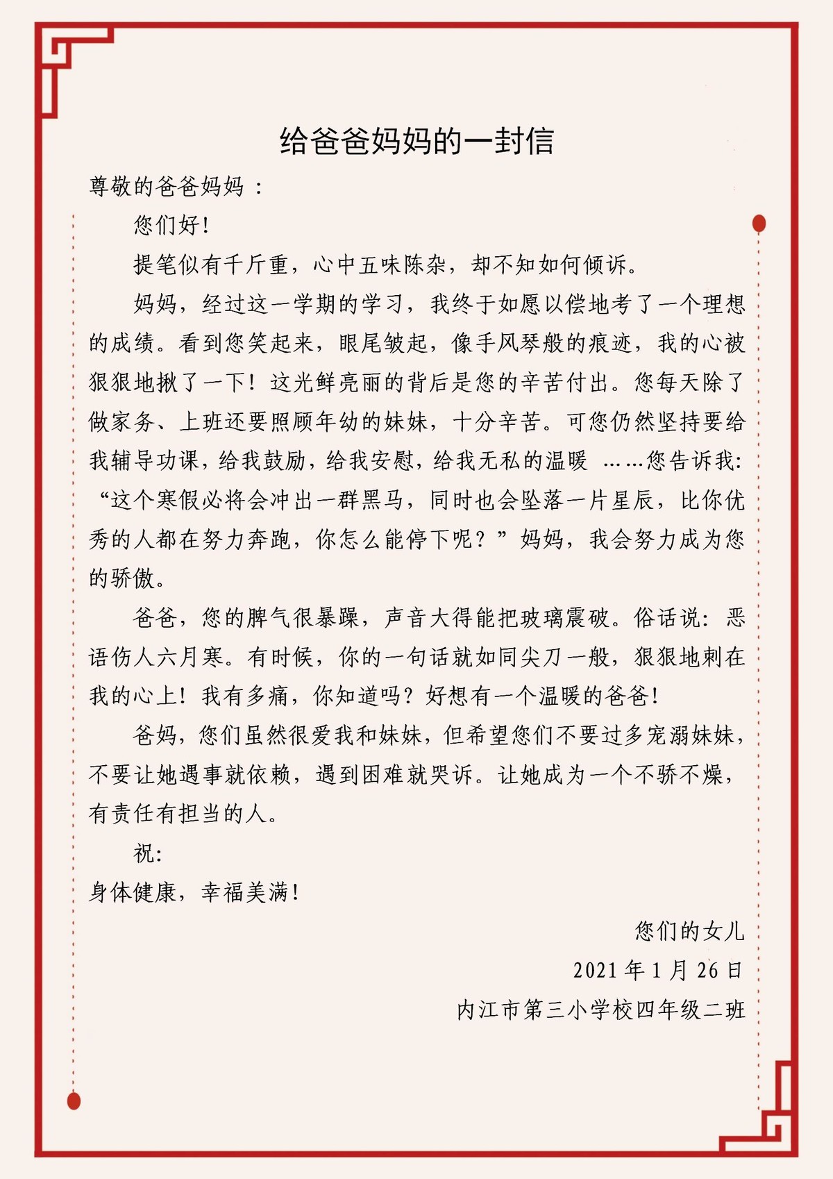 作品四《给爸爸妈妈的一封信》