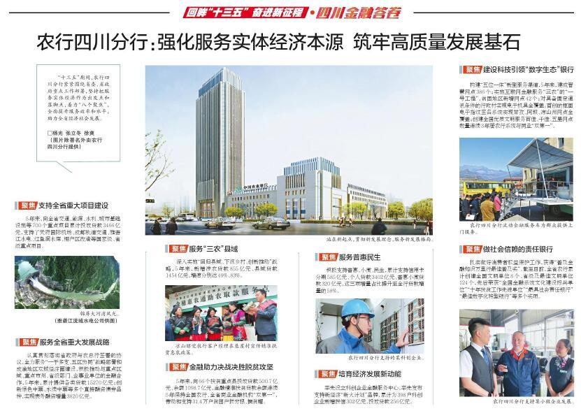 “十三五”期间,农行四川分行紧紧围绕省委、省政府重点工作部署,坚持把服务实体经济作为出发点和落脚点,着力“八个聚焦”,全面提升服务效率和水平,助力全省经济社会发展。