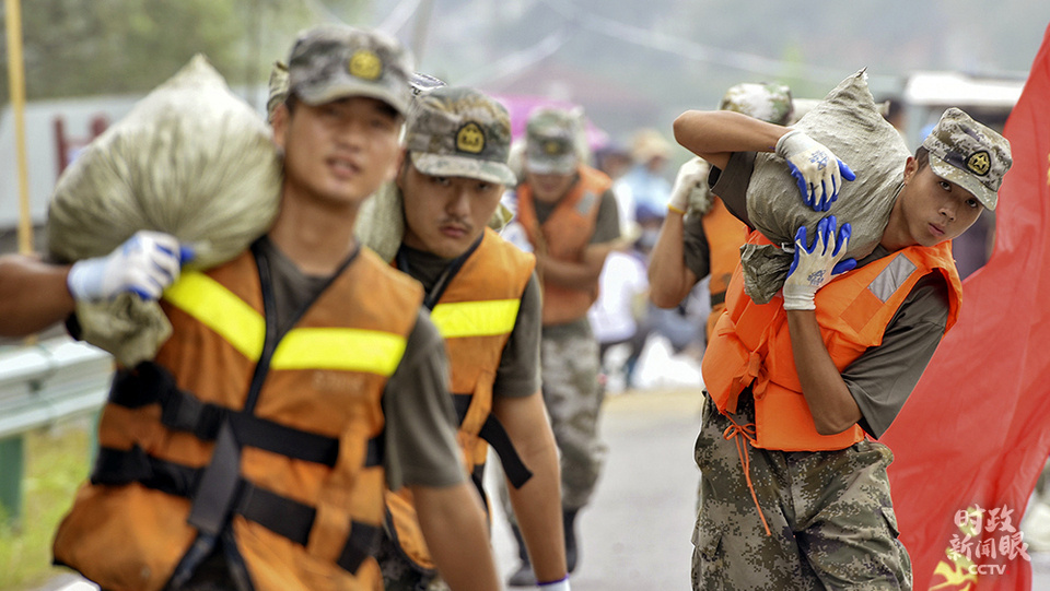 △2020年7月底,巢湖流域进入紧急防汛期。中国人民解放军73021部队铁骑先锋营430名指战员奔赴一线,扛沙袋加固巢湖大堤。