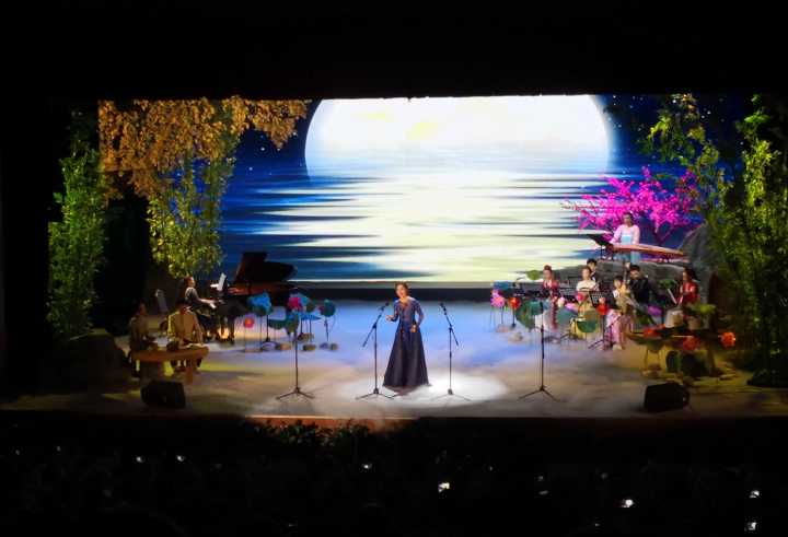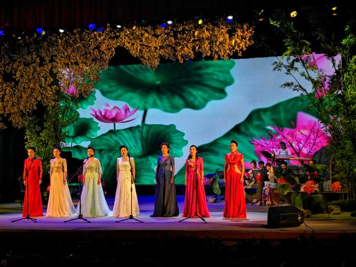 “莫听穿林打叶声,何妨吟啸且徐行。竹杖芒鞋轻胜马,谁怕?一蓑烟雨任平生。”一首全员亮相合唱的《定风波》,成为今晚节目单外的“序曲”特别礼物送给观众。歌者们身着长裙和黑色唐装或引吭高歌,或浅吟低唱,朗朗上口的诗词化作一起一伏的旋律,配以荷花池塘一角的钢琴伴奏,把人带入了千年之外的诗词之境。