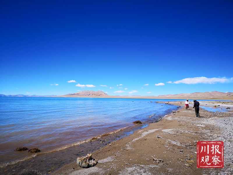 在车上远眺扎日南木措,一条蓝宝石般的水线闪烁着耀眼的光。沿着湖边继续前行,湖水越来越蓝,景色愈发迷人,愈显生机。