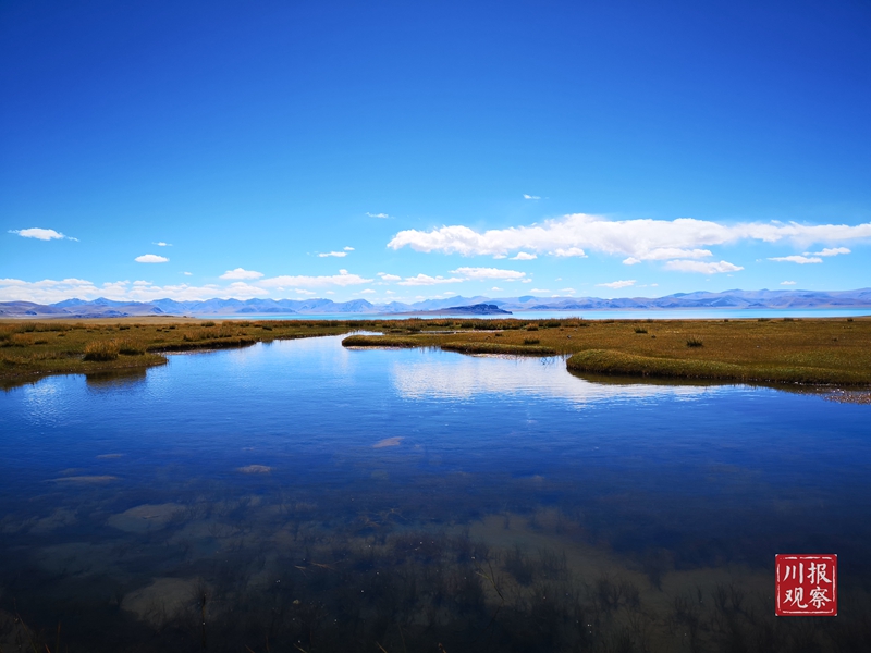 蓝天白云下,徐徐的微风吹过平静的湖面,湛蓝的湖水泛着波光,与远处的群山偎依在一起,似乎就在伸手可及之处,却又无法碰触。