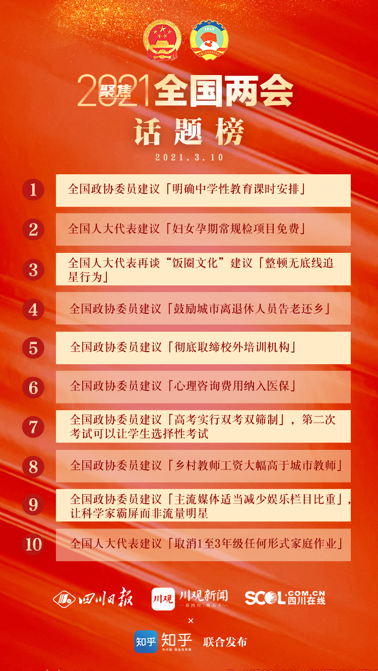 3月5日至3月11日期间,川观新闻联合知乎,每天发布“2021全国两会话题榜”,依托平台权威数据和智能分析,为你开启两会热点全网追踪,欢迎持续关注!