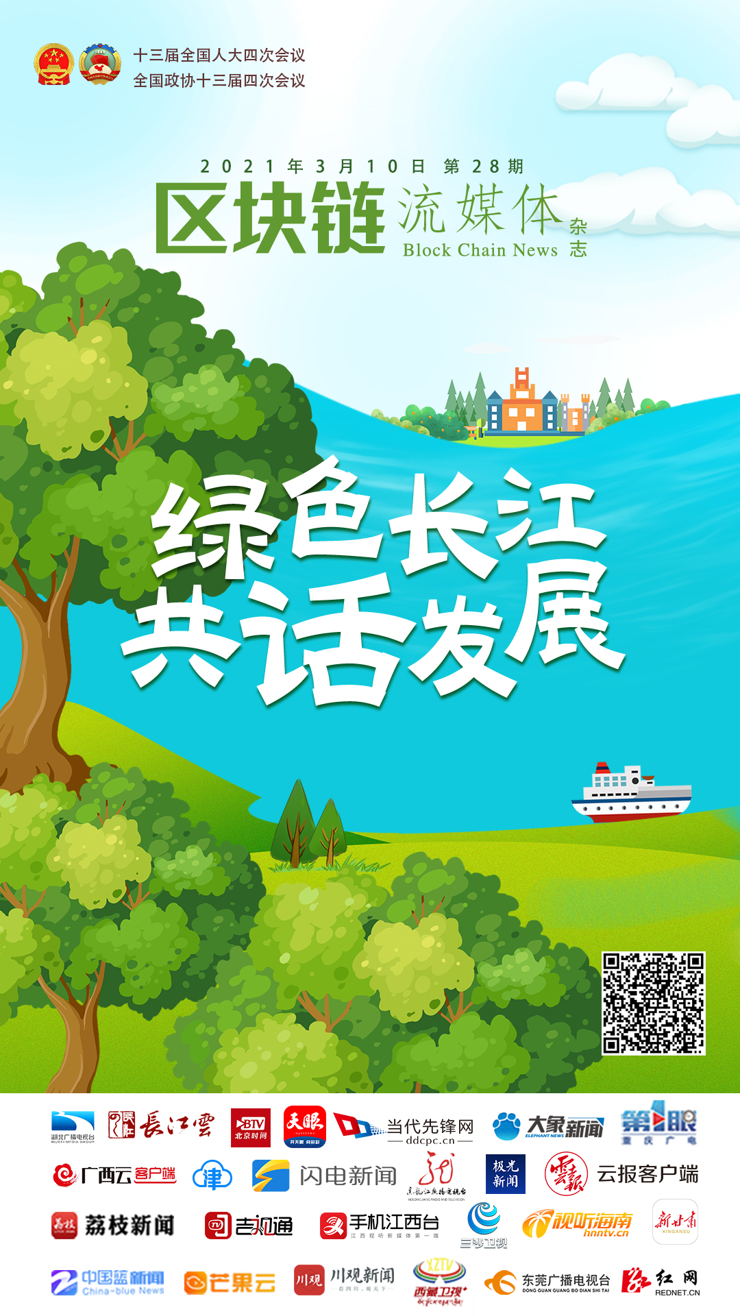 2021年全国两会之际,湖北广电融媒体新闻中心联动全国区块链新闻编辑部沿江11家省级主流媒体:川观新闻、手机江西台、重庆第1眼新闻、天眼新闻、云报、中国蓝新闻、荔枝新闻等,共话长江大保护,为长江经济带绿色发展建言献策。