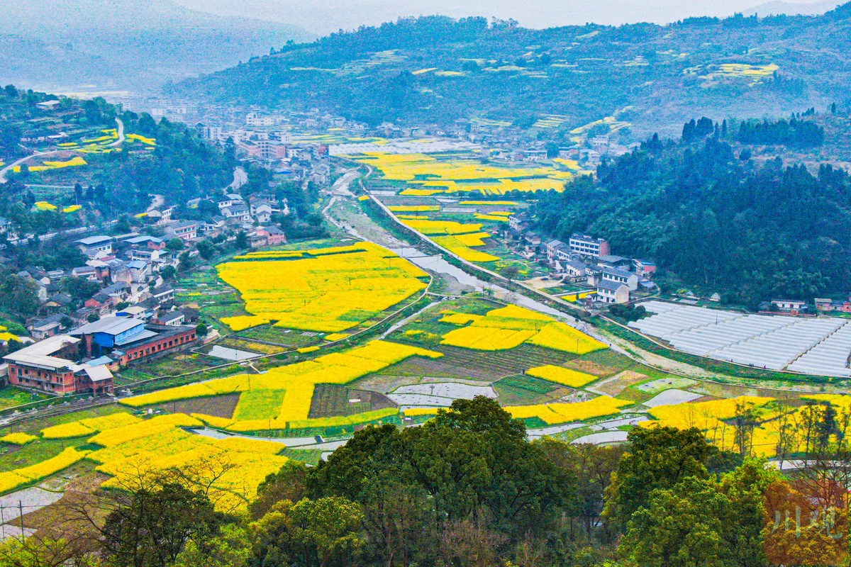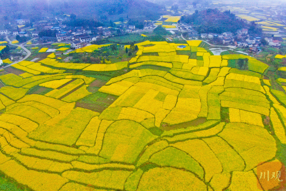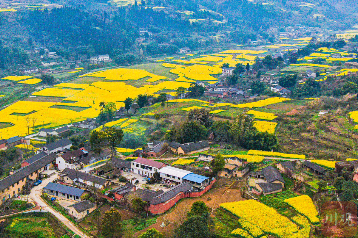 成片的金色花海铺满了山间盆地,给当地独特的低山地貌裹上了一层靓丽的妆容。据悉,新场镇的油菜花从2月中下旬开始绽放,预计持续到3月底。