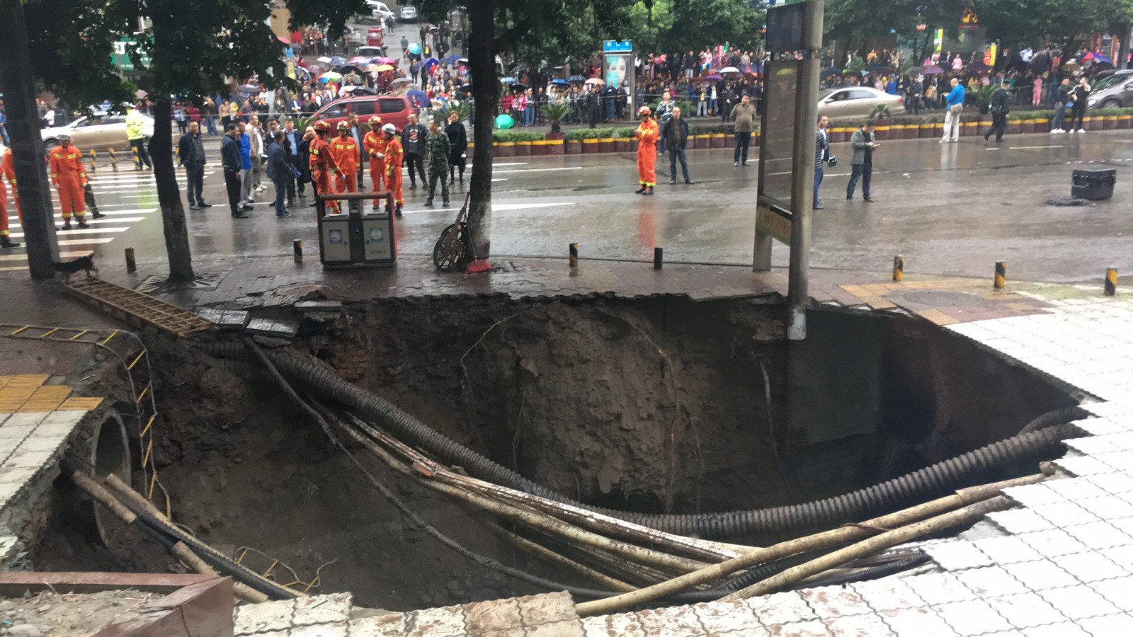 据现场目击者目测,陷落面积约10平方米,深度5-6米。达州市公安消防支队政委高明月告诉记者,根据监控录像初步判断,有4名行人陷落。现场拍摄的视频显示,在消防官兵救援过程中,塌陷路面还在二次垮塌。