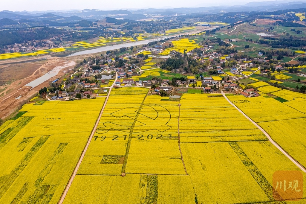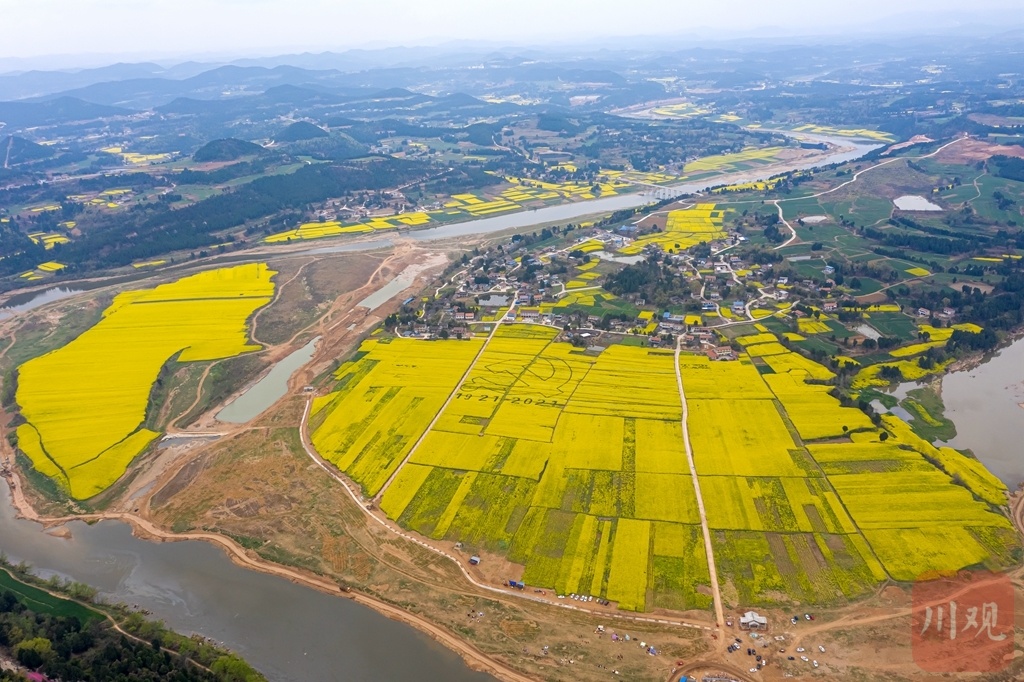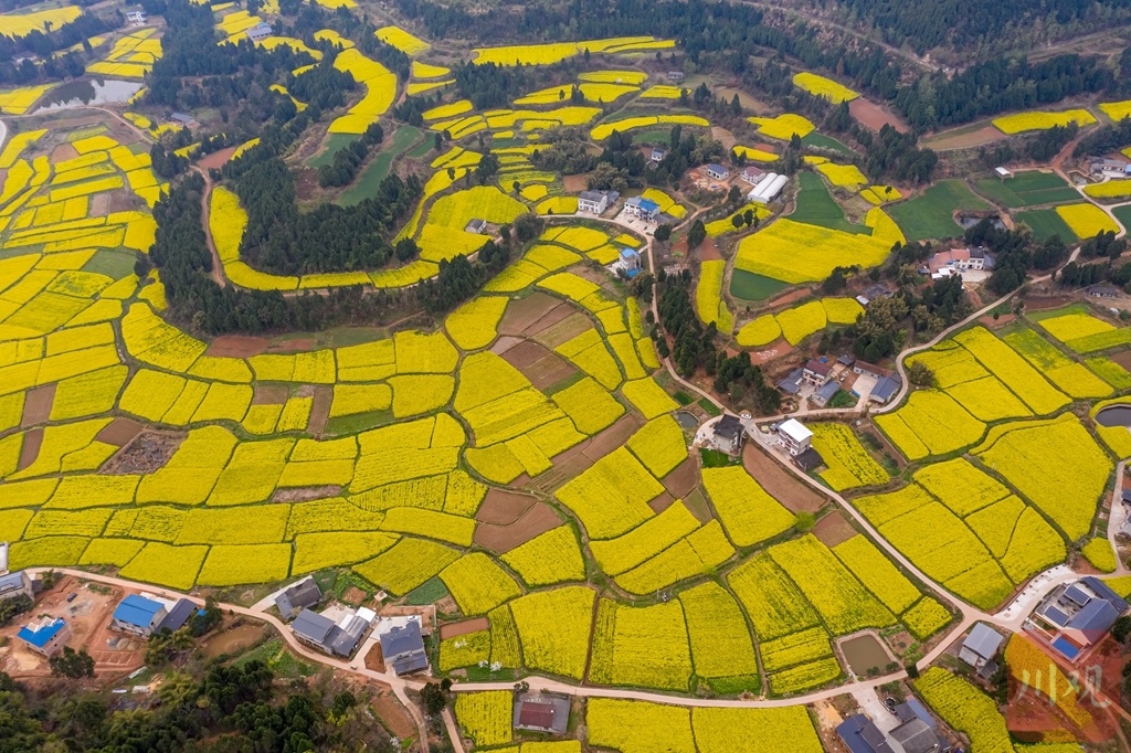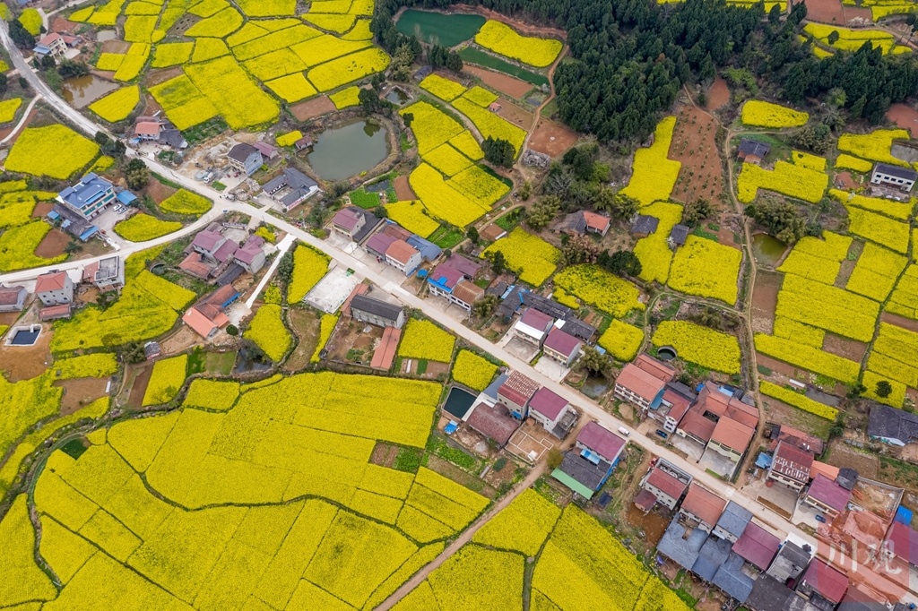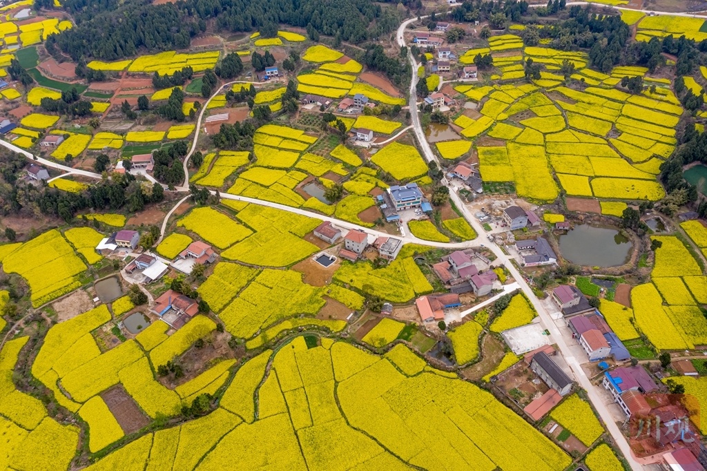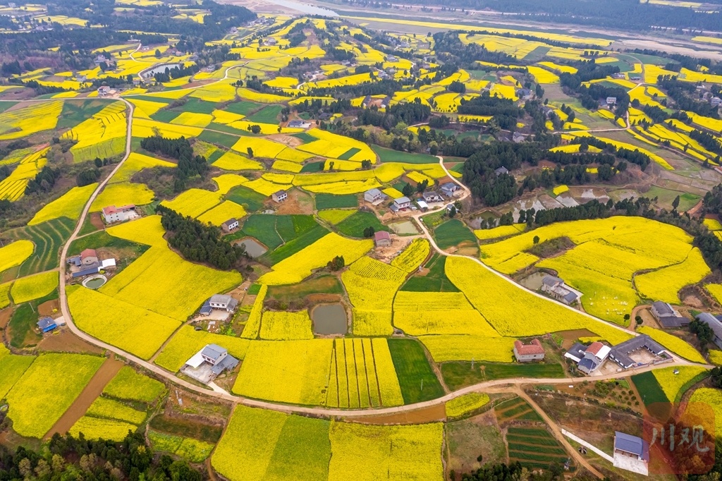 绵阳市梓潼龙台村的千亩油菜花竞相绽放,金色花海连绵不绝。一步一景,染醉了潼江两岸,游人如织,陶醉于花海之中。