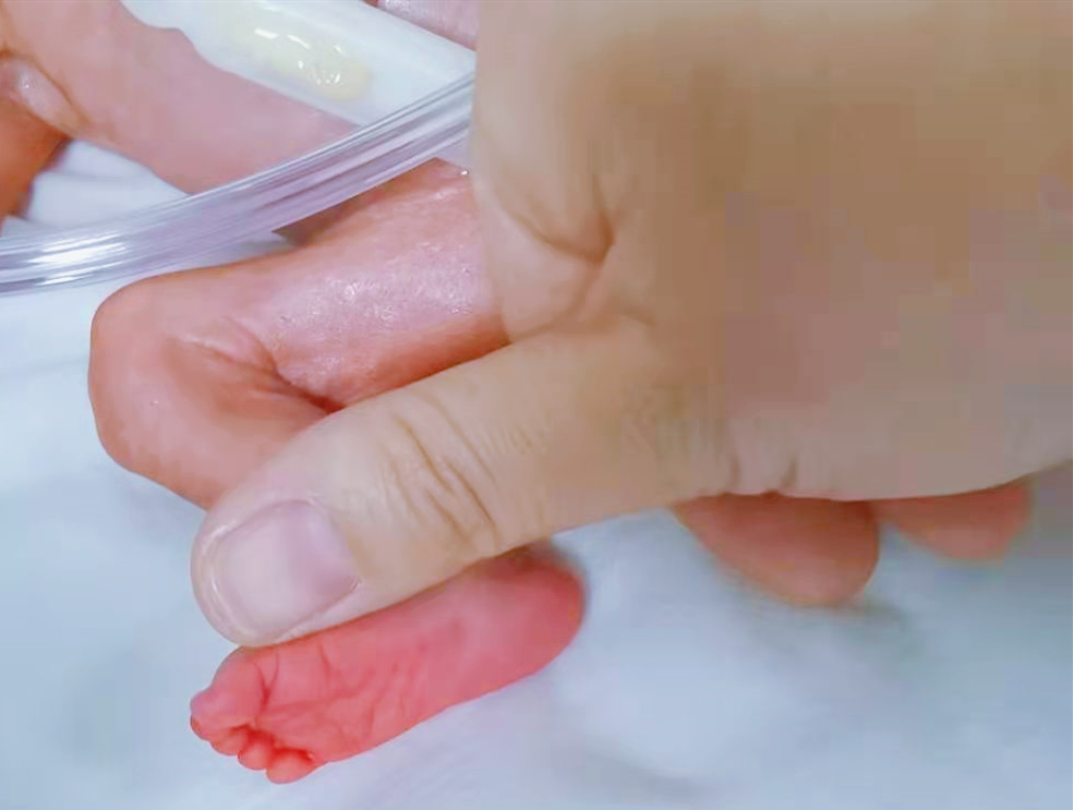 550克约等于一瓶矿泉水的重量,一名刚出生的女婴却只有这点体重,其危险可想而知。虽然早有准备,但当医务人员看到宝贝的那一刻,仍然惊诧不已——“小五”仅和成人手掌差不多大,呼吸孱弱,连眼睛都睁不开。新生儿复苏团队通过紧急抢救,才顺利帮她闯过了出生后的第一道难关,得以被转入新生儿科继续治疗。按照医学标准,“小五”属于“超低出生体重儿”和“小于胎龄儿”,其抢救难度成倍增加。