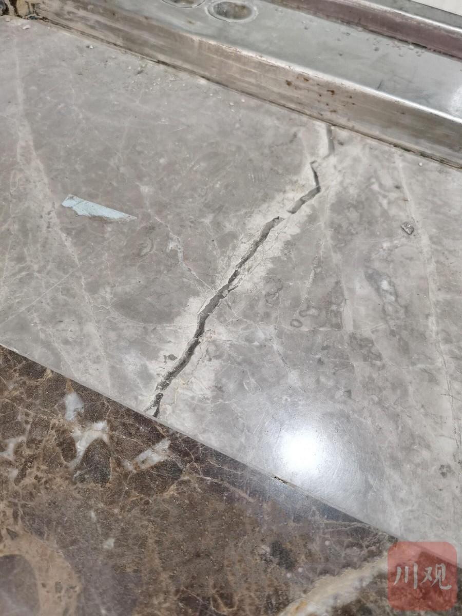 在客厅,李琴指着石材地板告诉四川日报全媒体民情记者,地面29块砖,其中21块裂纹,“地砖这方面反映了多次,一直都没有换”。