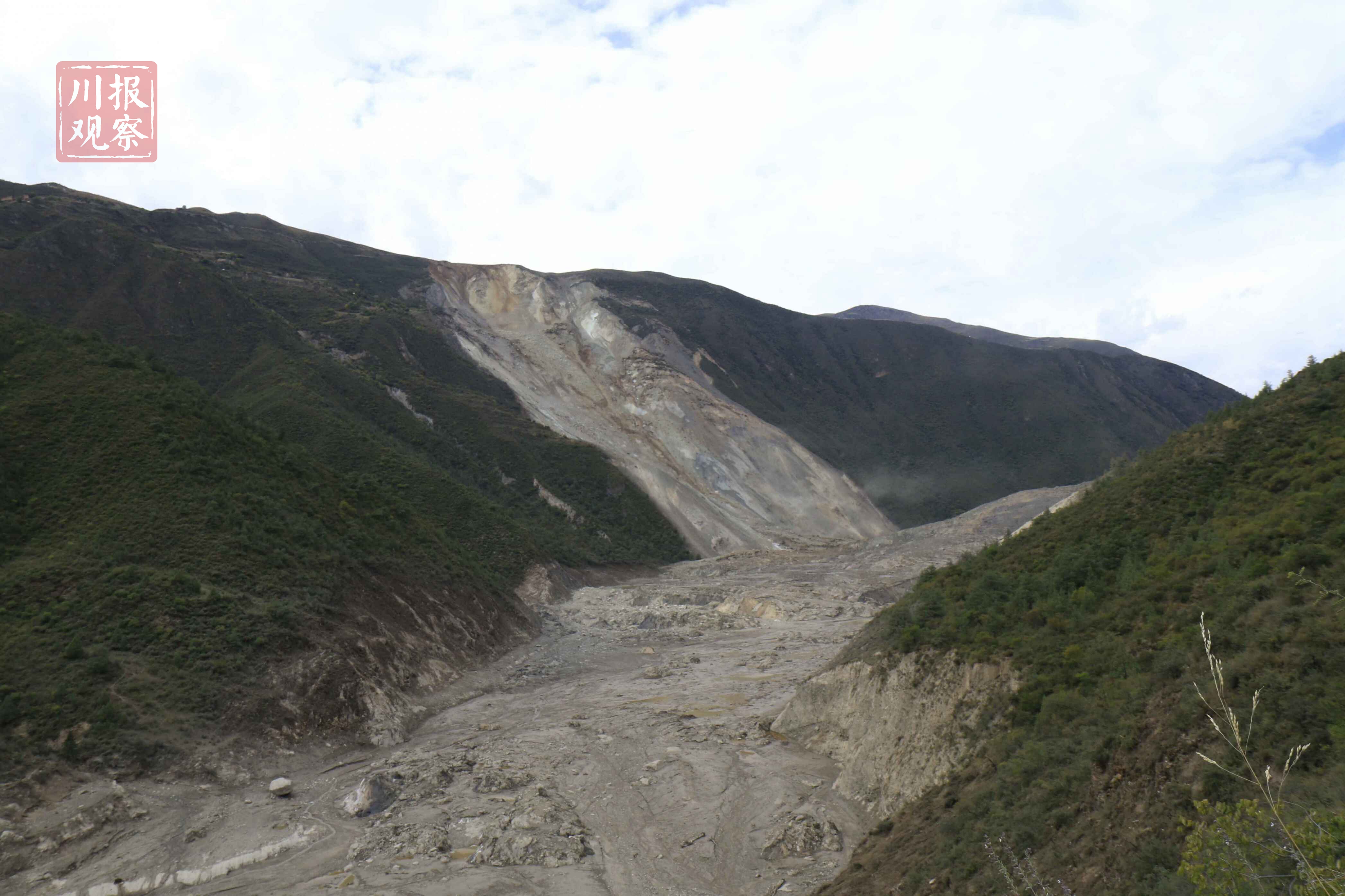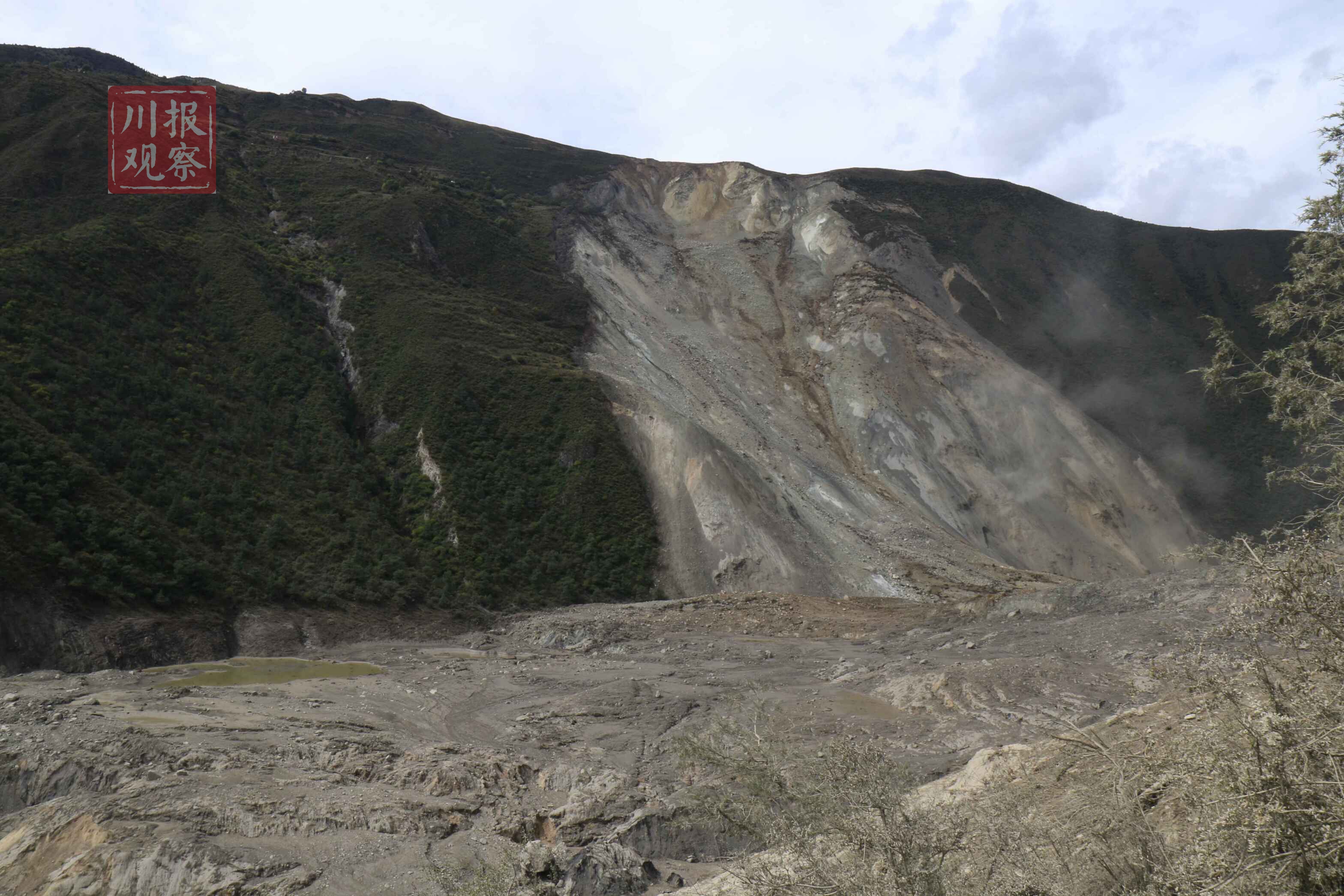 到达滑坡堰塞体已经是中午1点半,记者在这里看见到处是洪水掠过的淤泥,堰塞体东岸高西岸低,从头至尾呈梯级延伸大约1500米,给人感觉非常稳固,如果上游堰塞湖没过堰塞体向下游泄水,也不会轻易冲蚀毁灭堰塞体。