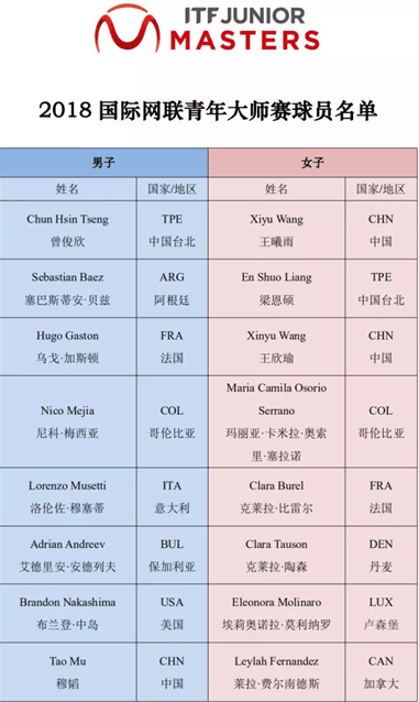 10月24日,全世界最高水平的青少年网球赛事——2018国际网联青年大师赛将在成都开打。10月14日,2018国际网联青年大师赛公布的最新球员名单,此次赛事将有男女各八位顶尖青少年球员参赛,都是四大满贯青少年赛事中的优胜者。值得一提的是,这16位青年俊杰中,中国选手就占据了五名,其中有三名内地球员、两名中国台北选手入围。