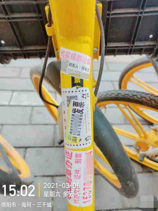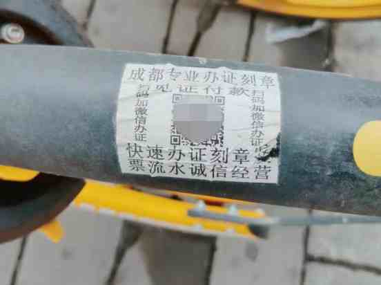 记者联系上了王先生,他表示自己住在绵山小筑小区附近,前几天晚饭后散步,他发现小区周边共享单车越来越多。“这些共享单车又旧又脏,座垫上全是灰尘,而且还贴满了小广告。”最让王先生气愤的是,这些共享单车车身上竟然贴着“成都专业办证刻章”的小广告。“说明这些共享单车就是从成都运过来的!成都使用过的旧车为啥子要往绵阳投放呢?”王先生提出质疑并表示,以前没出现过这种情况,投放的单车都比较干净,小广告也很少。