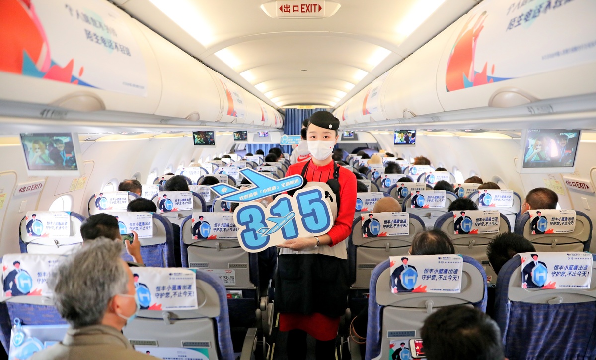 “欢迎搭乘恒丰银行成都分行‘小蓝盾’主题航班。本次航班由中国人民银行成都分行与恒丰银行成都分行全程护航,为每一位金融消费者的合法权益保驾护航。再次祝您旅途愉快,谢谢!”乘务员甜美播报。