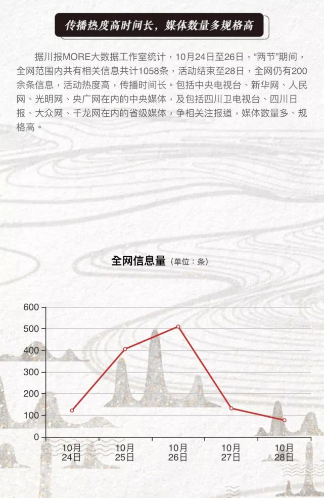 据川报MORE大数据工作室统计,10月24日至26日,“两节”期间,全网范围内共有相关信息共计1058条,活动结束至28日,全网仍有200余条信息,活动热度高,传播时间长。关注“两节”的媒体中包括中央电视台、新华网、人民网等众多央级媒体,媒体数量多、规格高。