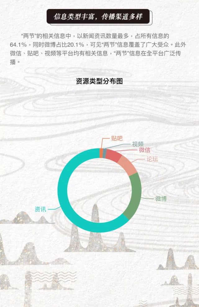 “两节”的相关信息中,以新闻资讯数量最多,占所有信息的64.1%,同时微博占比20.1%,可见“两节”信息覆盖了广大受众。此外微信、贴吧、视频等平台均有相关信息,“两节”信息在全平台广泛传播。