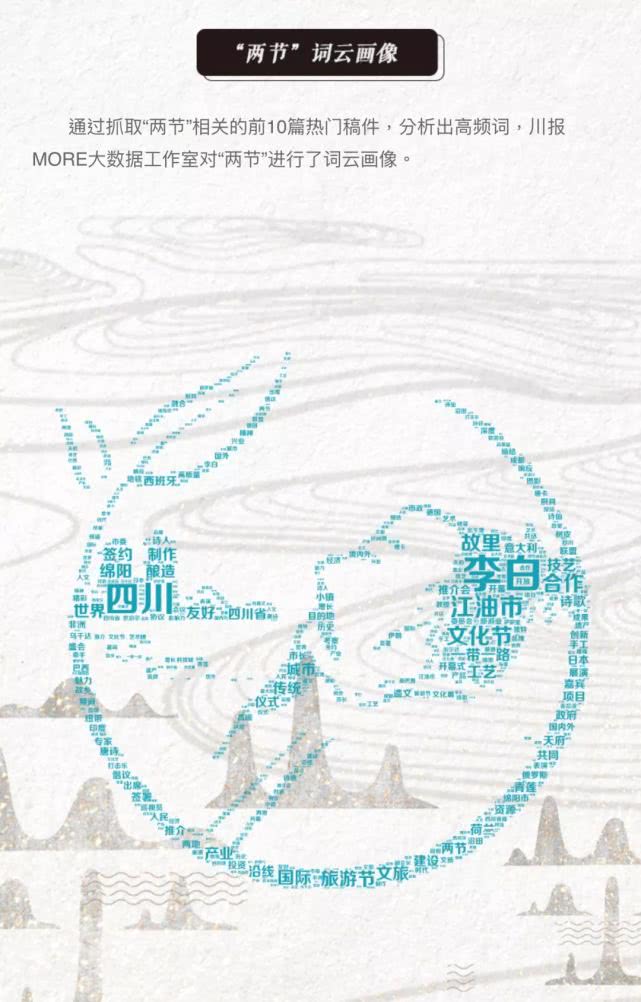 川报MORE大数据工作室通过抓取“两节”相关的前10篇热门稿件,分析出高频词,并进行词云画像。“一带一路”“合作”“旅游节”“国际”等均为“两节”的高频词。