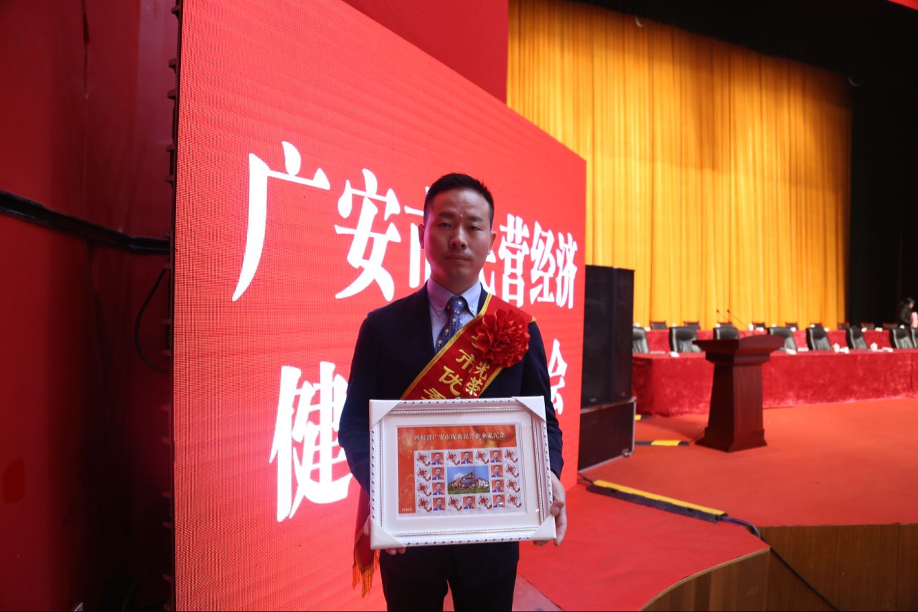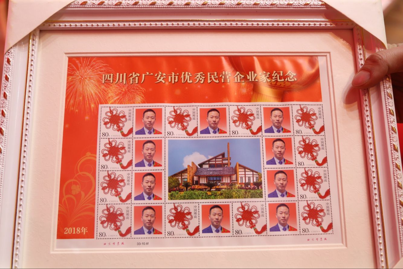 广安市优秀民营企业家、四川嘉逸股份有限公司董事长袁志友手抱为其定制的个性化邮票。