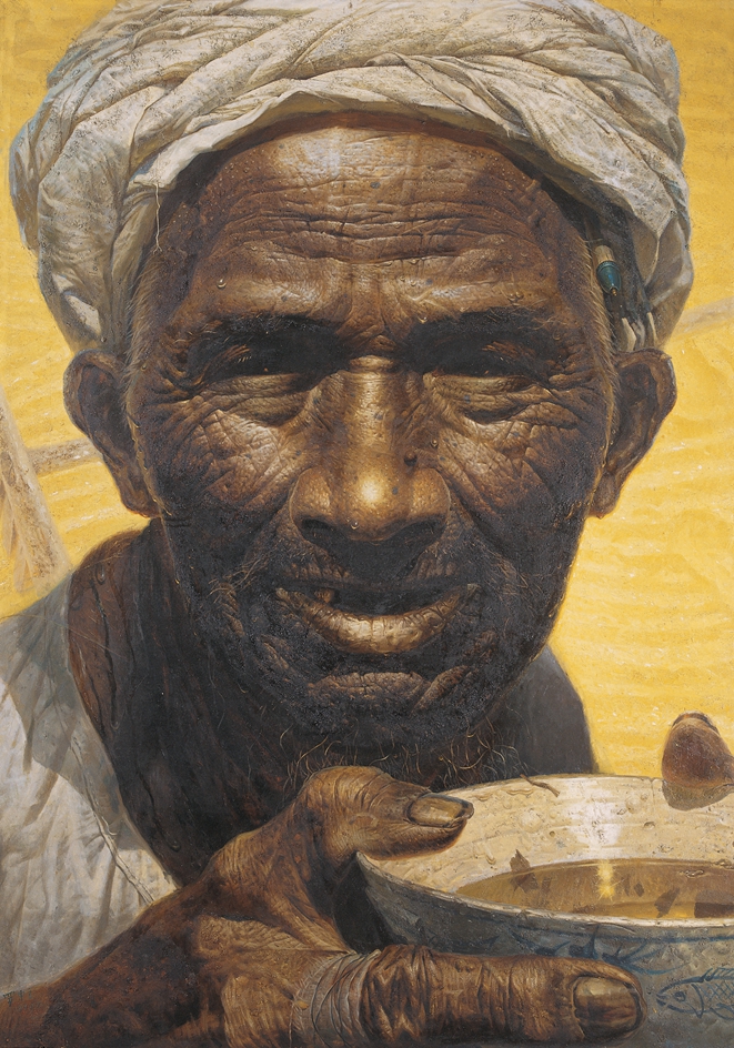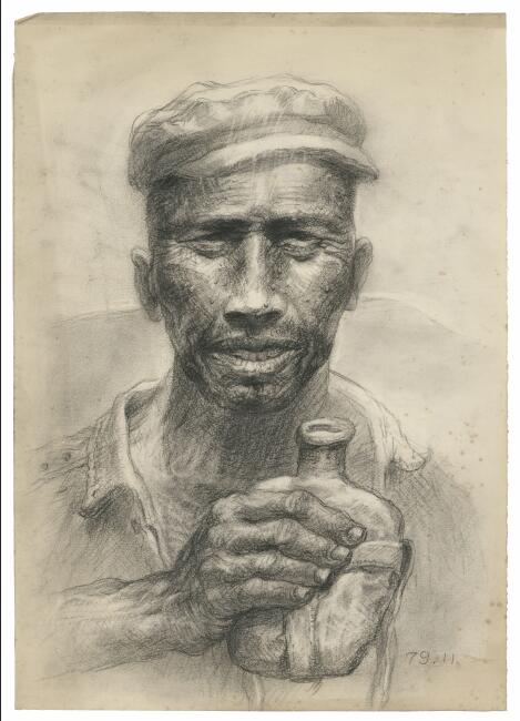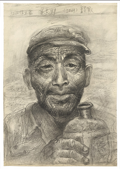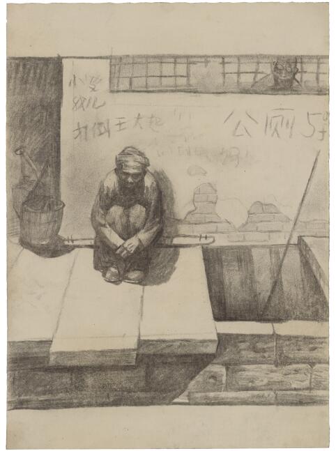 1975年的除夕夜,罗中立在路边公共厕所附近看到一位收粪的农民,他那种双手插在袖中蜷曲在墙边的僵硬姿态、呆滞麻木的神态与旁人热闹喜悦的气氛形成了巨大反差。这个场景触动了罗中立,激发了他对农民题材表现的渴望。一个多星期的时间,收粪老农在草图上呈现。这是最早的一稿。但一目了然的情节性表现还是没能摆脱罗中立之前画文学插图的套路。