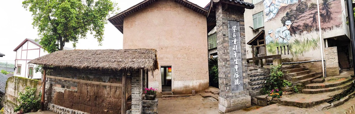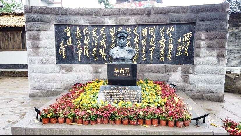 在广安市华蓥市禄市镇凉水井村“五谷丰登”地标正对面处,曲水漾漾,在太阳照射下泛着亮晶晶的光点,跨过流水,沿着不足一米宽,用青石板铺成的小道往里走,再爬一个斜坡,就可以看见新落成的毕占云生平事迹展陈馆。