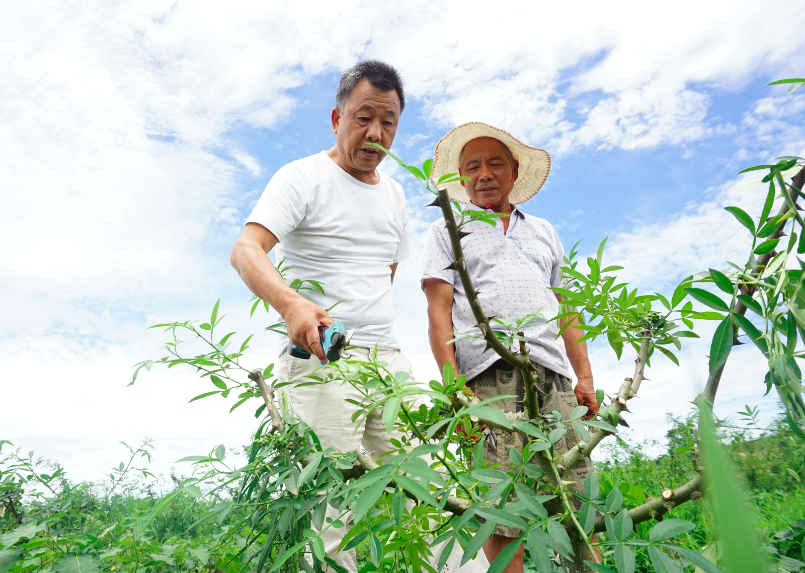 考虑到接下来的采摘等工序,就要在修剪时预留出便于操作的空间;还要考虑阳光朝向,当地藤椒一律按照行间距3米、株间距2.5米的要求种植,在修剪时就要在行间多留一些……