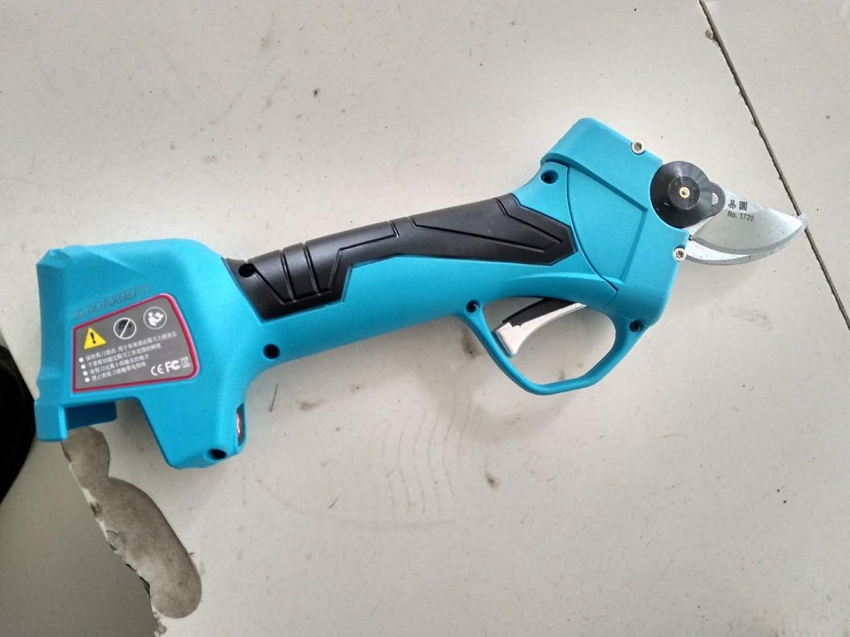 当时三台县城没有出售的店铺,他只有在网上购买。最初的电动剪刀还需要带一个蓄电池,使用时挂在腰上,用一根线连接手里的剪刀。现在他用的是一个更小巧的电动剪刀,类似于手枪形状,前端伸出两个小巧的剪刀刀刃,后面是装着电机和电池的机体,在握手的位置有一个类似手枪扳机的开关,轻轻一压就能将树枝轻松剪短,不费力。