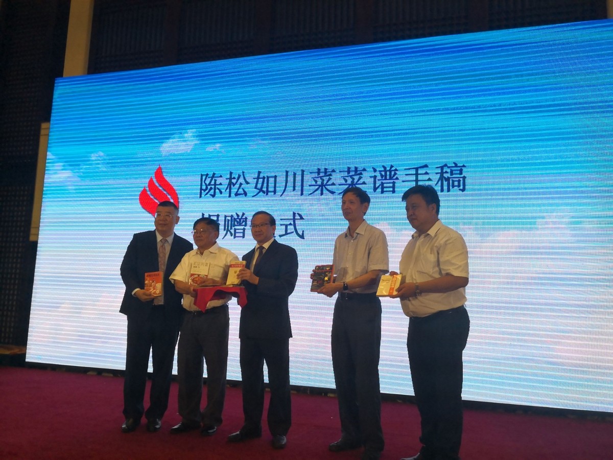 7月25日,第二届世界川菜大会新闻发布会现场,古稀老人陈廷龙向资阳捐赠了一份珍贵的手稿——“四川菜谱”。这是其父陈松如毕生的心血,他一生继承和自创了600道川菜菜品,被誉为“中国川菜掌门人”、“国宝级川菜大师”。