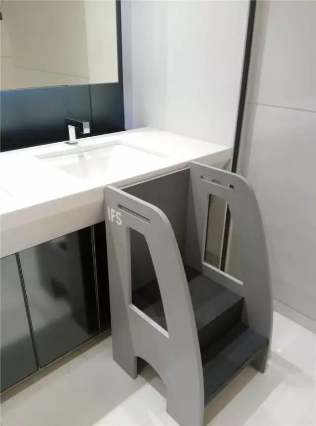 进门第一个洗手台就设有儿童台阶,方便小朋友洗手。